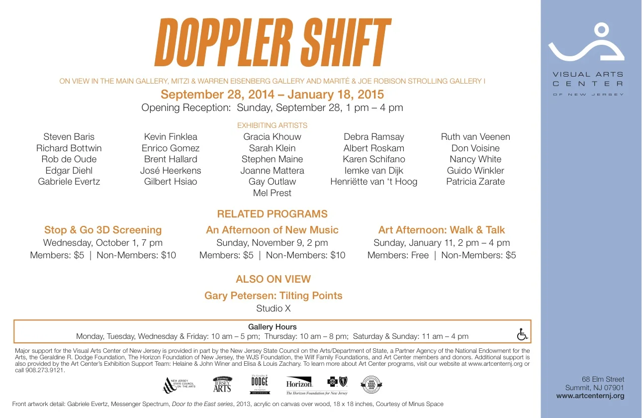 I'm honored that The Visual Arts Center of New Jersey will host DOPPLER SHIFT, a show curated by Mary Birmingham and inspired by DOPPLER, that I organized last year for Parallel Art Space. The show runs until January 18, 2015. See/ read: here, here, here, here