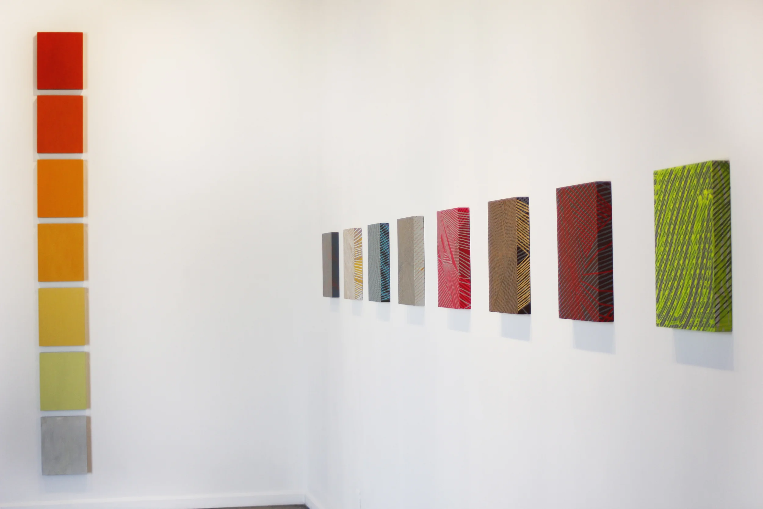 Mel Prest's work is inspired by naturally occurring light phenomena. Rainbow Weather, her new installation and one of her largest works to date, plays off moments of clarity, obscurity and high drama she sees in the sky. Rainbow Weather utilizes and expands on a series of 5 x 5 x 2" paintings on panel Prest made over the past few years, which have never been shown. Using these panels and their colors as a starting point, she created a large wall installation designed specifically for the space. The new work incorporates several different structures: single panels, grouping where colors and internal forms play off one another, and "ladder" shapes (28 panels hung in 2 parallel lines). Prest has composed clusters of seemingly monochrome panels, though most have their sides painted, and some have low contrast colors painted on the surface. Rainbow Weather also includes a hand-drawn wall painting in pale yellow that rests under the panels, shifting in visibility as viewers move around the piece. This is the first time Prest has shown a wall drawing and painting panels together as a single installation.